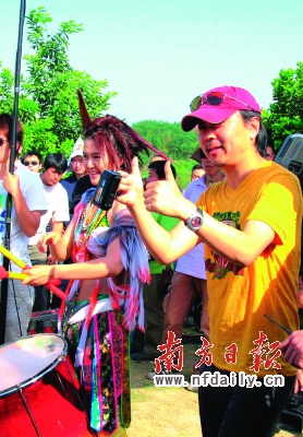 據(jù)悉,“五一”期間在成都舉辦的熱波音樂節(jié)是片中一個(gè)拍攝場(chǎng)景。從記者獲得的劇照來看,譚維維正率領(lǐng)一群裝扮火辣的鼓手,一邊打鼓一邊起舞,場(chǎng)面動(dòng)感。而譚維維的造型也是首度曝光,她以一身清涼露臍裝亮相,加上具有民族元素的鮮艷裝飾和文身點(diǎn)綴,更顯火辣。尤其是她的發(fā)型卡通味道濃郁,一縷縷火箭般的沖天直發(fā),十分夸張。