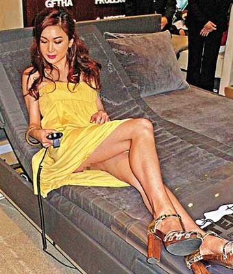 中新網(wǎng)11月7日電 美國小天后Britney Spears(布蘭妮)去年被拍到?jīng)]穿內(nèi)褲成為全球一時(shí)熱話;沒料到“海潮”溫碧霞也有驚人之舉,繼以41歲之齡拍攝終極噴血寫真集后,昨日她穿招牌露肩連身短裙出席床褥宣傳活動(dòng),其間躺電動(dòng)床上扭腰大擺造型時(shí),懷疑下身真空的她不慎春光乍泄,但事后她卻堅(jiān)稱自己有穿內(nèi)褲。