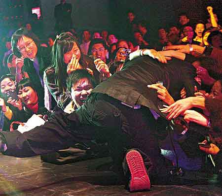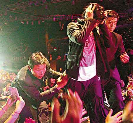 力宏與熱情歌迷握手時(shí),有歌迷緊拉他的手不放,他沒(méi)想后果便也以熱情響應(yīng),蹲下來(lái)與歌迷手牽手地繼續(xù)唱歌,旁邊大班女歌迷見(jiàn)狀也馬上伸出手親近偶像,霎時(shí)間群情洶涌,一個(gè)又一個(gè)女歌迷如狼似虎地抓向力宏,未幾他已被歌迷扯離舞臺(tái),整個(gè)人頭向下身體凌空在臺(tái)邊,只剩一只腳撐著臺(tái)板,該舞臺(tái)離地約一米高,眼看力宏快要跌下臺(tái)之際,此時(shí)才有兩名保安沖上臺(tái)及時(shí)抱住他的腰,意外才不致發(fā)生。