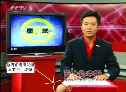 2007年8月13日,在直播《天下足球》時(shí),上半身身著西裝的主持人段暄卻在播音桌下伸出一條沒穿西褲的腿。