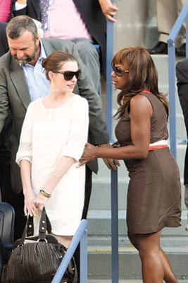 接連出席完威尼斯與多倫多電影節(jié)的安妮·海瑟薇(左)又馬不停蹄地出現(xiàn)在美網(wǎng)決賽場(chǎng)邊。