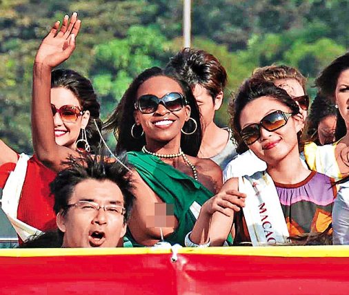 大會昨午安排33號至63號佳麗參觀大嶼山寶蓮寺,原定之后再到青馬大橋,但因時間延誤而取消。佳麗昨午先由將軍澳電視廣播城乘開篷巴士前往東涌,然后再乘專車參觀大佛。為一覽香港迷人景致,佳麗紛紛走上巴士上層。沿途清風送爽,佳麗興奮得不停跟記者揮手打招呼,但風勢越來越猛烈,穿上大圓領T恤的贊比亞佳麗63號Chipo Mulubisha,忘形地跟記者揮手打招呼之際,她闊闊的袖口位竟被猛風吹到移位,結果真空上陣的她不慎露出整個右胸。另外,有部份佳麗則被大風吹到頭暈而要吃話梅止嘔。