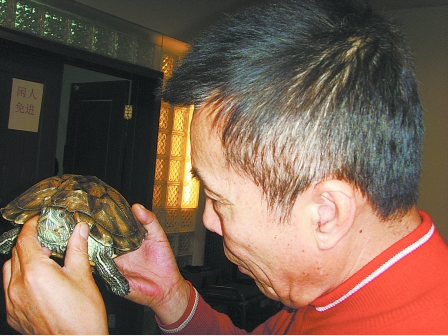 也許是看春晚小品劇本看累了,何慶魁干脆走出自己的臥室,和新買(mǎi)的烏龜玩了起來(lái)。一會(huì)用手輕輕撫摸烏龜?shù)奈舶,一?huì)用臉碰一下烏龜?shù)谋常粫?huì)用嘴親吻烏龜?shù)念^部。何慶魁兒子何樹(shù)成告訴記者:“老爸跟它親熱得很!其實(shí)這個(gè)烏龜才買(mǎi)來(lái)幾天!焙螒c魁笑著說(shuō),這個(gè)烏龜跟他有緣,親手養(yǎng)了幾天,烏龜跟他特別親近。“它現(xiàn)在都不怎么吃東西了,經(jīng)常縮頭不肯動(dòng),但是我抱起它,摸摸它,它就會(huì)伸頭出來(lái)看看我,和我親親!