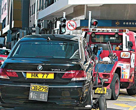 掛上紀(jì)念朱玲玲當(dāng)選港姐年份HK77車(chē)牌的寶馬,昨日也被拖車(chē)拖到寶馬車(chē)廠。