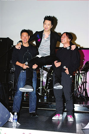 發(fā)布會現(xiàn)場,心情不錯的庾澄慶經(jīng)常大笑得前仰后合,張學(xué)友和陳奕迅更是讓他興奮不已。兩位好哥們兒送上大包的零食,祝福庾澄慶在香港更加“吃得開”。在哥兒仨開唱之前,張學(xué)友特別提醒眾人:“請大家注意歌詞!扁壮螒c哭笑不得地唱起了《愛你的只有一個我》,張學(xué)友和陳奕迅一邊和聲一邊搞笑地伴舞。拍合影的時候,張學(xué)友和陳奕迅合力把站在中間的庾澄慶扛上肩膀,張學(xué)友還不忘問道:“這下心情好很多了吧?”再三被追問如何對待妻子伊能靜的“外遇”,庾澄慶說:“處理完之后會告訴大家的。”至于是否擔(dān)心這個時候推出新碟會被質(zhì)疑借機炒作,庾澄慶表示:“我不會拿家里的事情做新聞點,更何況這件事情很重要。如果我不工作把自己關(guān)在家里,就是很好的解決方式嗎?不是! 記者 朱雅清