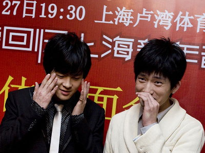 僅發(fā)行了一張EP和一張專輯便來上海舉辦演唱會(huì),除了人氣,BOBO組合的勇氣也令人佩服。昨日下午,兩位成員在滬上舉行記者會(huì),宣布將于本月27日在上海盧灣體育館舉行首場個(gè)唱。目前成員井柏然正在拍攝電視劇《向周星馳致敬先》,對(duì)于日前曝光的山寨版“至尊寶”形象,井柏然信心十足地說:“我比周星馳帥!”