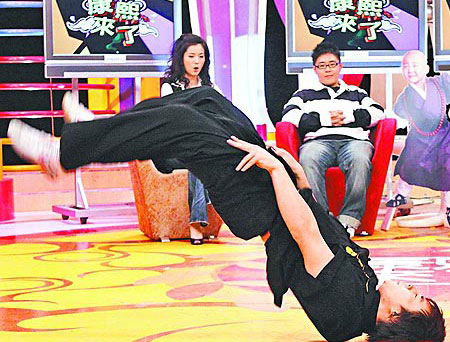 釋小龍(前)昨錄《康熙來了》表演在地板上翻身躍起的動作。