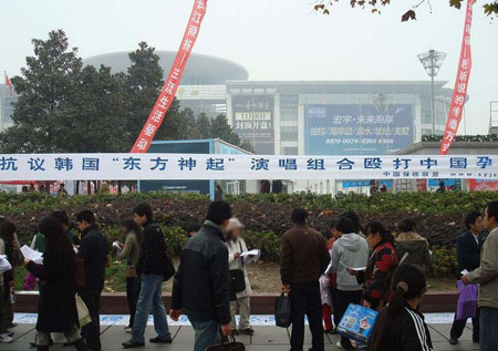 中新網(wǎng)12月26日電 近日,一篇題為《東方神起武漢演唱會(huì)前夕遭現(xiàn)場抵制》的帖子熱傳國內(nèi)各大網(wǎng)站論壇,該帖一出即引發(fā)大量網(wǎng)友口水戰(zhàn)。文章說,2008年12月20日,來自武漢三鎮(zhèn)的志愿者在武漢會(huì)展中心地區(qū),就“東方神起”針對(duì)中國女性的暴力行為發(fā)動(dòng)簽名抗議,志愿者高舉“抗議韓國‘東方神起’演唱組合毆打中國孕婦”條幅,呼吁市民積極參與此次抵制活動(dòng)。雖然到目前為止,整件“毆打孕婦”事情的真?zhèn)涡赃沒有一個(gè)官方的說法,但網(wǎng)友這種自發(fā)的行為還是吸引了大量的觀望著,甚至有眾多路人在條幅上簽名表示支持。