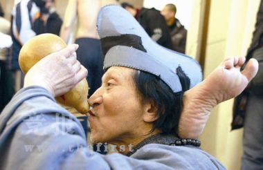 在演員較為集中的一個(gè)大會(huì)議室中,一個(gè)赤膊的青年男子在往身上涂金黃色的顏料,化妝師在給姑娘們卷頭發(fā)。角落的地面上,“濟(jì)公”旁若無(wú)人,一手拿著扇子,一手拿著葫蘆,腳后跟枕在腦后,似乎在練“柔術(shù)”。