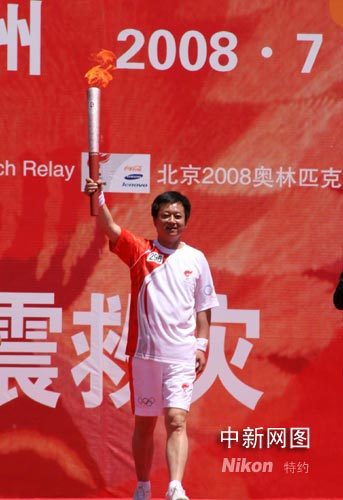 08年7月7日,奧運(yùn)火炬在甘肅蘭州傳遞,中央電視臺(tái)著名節(jié)目主持人朱軍在自己的家鄉(xiāng)蘭州擔(dān)任最后一棒火炬手。記者周兆軍攝