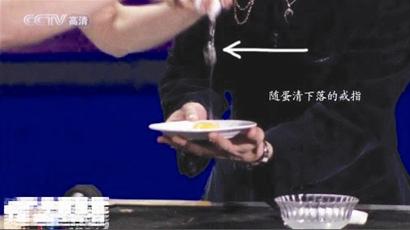 圖七,好了,這一動作做完后,劉謙用左手接過董卿的戒指把玩一番,并問董卿這枚戒指有多貴,這一過程,劉謙很自然地把戒指放到了右手,注意,是塞到了右手的食指和拇指中間,因為右手的食指和拇指中間已經(jīng)捏著個被皮筋拉扯的掛鉤,塞進(jìn)戒指后他用左手扭動著戒指,好像在做下意識的動作,其實,是把戒指環(huán)掛到那個掛鉤上,這一動作是在右手的食指和拇指“捏合”之中完成的,觀眾是看不到的,由于角度的原因,觀眾也看不到那根細(xì)細(xì)的皮筋。