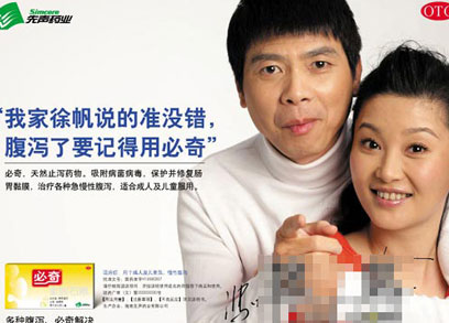 廣告中,徐帆讓馮小剛猜一樣物品,答案是××止瀉藥,而在該商品的站牌廣告上,馮小剛從背后摟著徐帆,旁邊的廣告詞寫著:“我們家徐帆說的準沒錯,腹瀉了要記得用××!睂τ谶@個廣告,有消費者提出異議:“馮小剛是否在扮演消費者的角色,并鼓吹其藥品功用?”