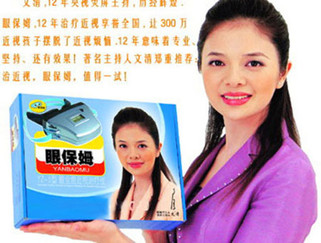 央視主持人文清曾代言治療近視的醫(yī)療器械的“眼保姆”,因廣告“涉嫌欺騙和誤導(dǎo)消費者”而被工商局曝光。在廣告中含有大量不科學(xué)的表示功效的斷言和保證,同時還聲稱“產(chǎn)品銷售現(xiàn)場場面壯觀、多家護眼中心產(chǎn)品斷貨”等,夸大其辭的廣告語。