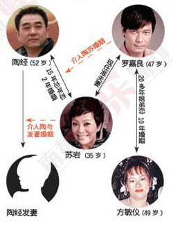 蘇巖和羅嘉良的結(jié)婚,用那個(gè)落后保守的詞來說,是兩個(gè)第三者的婚姻。蘇巖曾是中國(guó)電影第一錄音師陶經(jīng)的妻子,愛情源頭還是張藝謀的《活著》。蘇巖甘當(dāng)陶經(jīng)婚姻第三者,歷經(jīng)十多年終于結(jié)婚,而羅嘉良這次又介入了蘇巖的上一次婚姻。一直有猜測(cè)說蘇巖是導(dǎo)致羅嘉良與發(fā)妻離婚的第三者,其實(shí)不是,反倒是羅嘉良讓蘇巖下決心離婚的。現(xiàn)在兩人還在北京買了豪宅,羅嘉良正式落戶內(nèi)地了。
