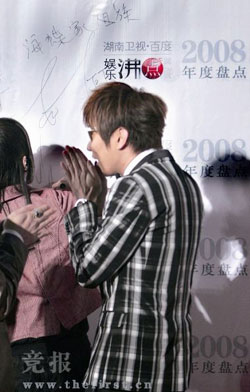 昨晚,首先走上紅毯的就是JJ林俊杰,他先是“護送”著阿Sa和容祖兒出場,待兩人和主持人“接頭”之后,又趕回了紅毯的始發(fā)地,迎接自己公司力捧的兩位小師妹BY2。不過忙中出亂,想在簽名板上簽下“海蝶家族”的他一時間寫成了“海蝶家且”,發(fā)現(xiàn)不妙后立即把且劃掉了,寫下了族,搞得臺下的影迷們緊張了半天。
