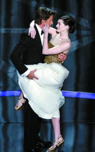 每一次頒獎嘉賓上臺前,一身正裝的杰克曼都會用一小段串聯(lián)詞引出頒獎嘉賓,當(dāng)娜塔莉·波特曼和本·斯蒂勒上臺頒最佳攝影獎時,全場觀眾驚呆。大變臉的斯蒂勒戴著大胡子和墨鏡,完全看不出真面目。上臺后,波特曼忙著在一旁致詞,但斯蒂勒卻東張西望,自顧自地嚼著口香糖。波特曼終于忍無可忍了,“你竟然在嚼口香糖,快吐出來。 ”斯蒂勒故做緊張狀,把口香糖黏在桌上。隨后仍東張西望,注意力完全不在臺上,“輪到你發(fā)言了。 ”波特曼提醒道,沒想到斯蒂勒竟然拿 《貧民富翁》開涮,“我聽說《貧民富翁》是用手機(jī)拍攝的一部電影。 ”說罷,斯蒂勒竟拿出一部手機(jī)擺弄起來,待到波特曼介紹提名影片時,斯蒂勒又開始在舞臺上四處游走。