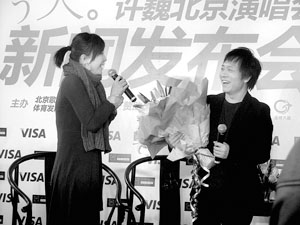 歌手許巍將于4月10日在北京工人體育館舉行個人演唱會——“今天”,這一消息昨日在京發(fā)布。好友——歌手葉蓓手捧鮮花抵達發(fā)布會現場道賀。