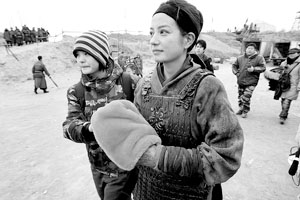 和《赤壁》一樣,《花木蘭》的片場倚水而建,臨時(shí)搭建的茅草屋、馬廄、高大的烽火臺(tái)、箭樓,到處都是枯草,一種清冷肅殺的氣氛油然而生。