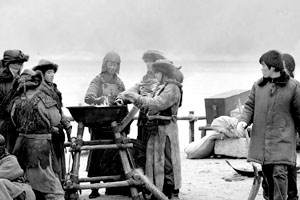 記者昨日在現(xiàn)場看到,每當(dāng)拍戲的間歇,演員們就三五成群地圍到行軍火盆旁邊烤火、聊天。還有的演員扭在一起摔跤,以運(yùn)動(dòng)來增加熱量。