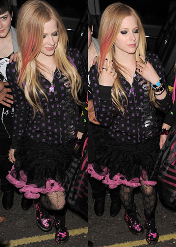 3月18日,艾薇兒和好友去夜店玩,身穿黑色底色外套,上面有這神秘藕合色骷髏頭的連帽外衣,下面配了粉色的蕾絲小裙子,黑色的花紋絲襪,配上艾薇兒金色頭發(fā),枚紅色的挑染,實(shí)在是太好看了,甜美中有這搖滾的個(gè)性,讓你想說(shuō)不喜歡都難。
