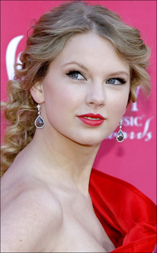 泰勒·斯韋福特,一襲紅色及地禮服,斜肩設(shè)計(jì),露出白嫩的肩膀,整個(gè)人嫩白如雪,嬌媚無比。