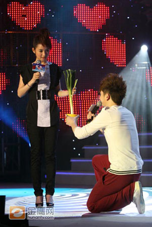 這位當(dāng)紅的人氣偶像不僅迷倒了在場的觀眾,連“海豚王子”王櫟鑫都拜倒在林依晨的裙下,現(xiàn)場更是搞笑上演抱蔥求婚一幕。林依晨獻(xiàn)唱了《你》后,在特別環(huán)節(jié)中接受了演技大考驗(yàn),主持人即興要求林依晨表演“求婚”的橋段。這時(shí),一旁的王櫟鑫按耐不住,自告奮勇上臺“求婚”。調(diào)皮的王櫟鑫手捧一顆大蔥,單腿跪下對林依晨深情告白:“親愛的晨晨,我知道你喜歡直樹,所以我送你一顆蔥。雖然我沒有你家直樹帥,但我會每天為你唱情,對你好,嫁給我好嗎?”惹得現(xiàn)場觀眾大笑不已,一邊的男主持人大左更是醋意大發(fā),直言喜歡林依晨很久,也要向她求婚,不過大左的求婚禮物是非常具有長沙特色的臭豆腐。面對一大盤黑乎乎的臭豆腐,林依晨似乎被其獨(dú)特的氣味嚇到,捂著鼻子直呼“我還是選擇蔥吧!”場面十分搞笑,晚會氣氛也達(dá)到了高潮。