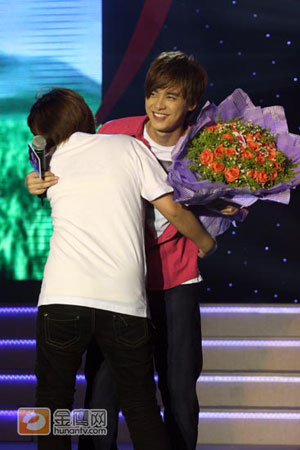 此次重回“福地”的王櫟鑫,與現(xiàn)場歌迷大玩游戲,不但與觀眾互動演繹了一出《劉海砍樵》,更與歌迷親密合唱了一首《天生一對》,頗為搞怪的舞姿、多變的表情令現(xiàn)場氣氛更為火爆。和李易峰一樣,王櫟鑫也遭遇了熱情粉絲的大熊抱。