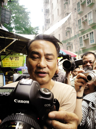 昨天的拍攝地點(diǎn)叫永利街。那是很窄的一條街道,其中一邊已經(jīng)改造成了高樓,另一邊則保留了一些舊樓。劇組在舊樓這邊搭了些鐵架和舊式廣告招牌,營(yíng)造上世紀(jì)60年代的氣氛。導(dǎo)演羅啟銳介紹:“這條街是香港最后一條60年代老街了,本來(lái)已經(jīng)要拆掉,但是政府為了關(guān)照我們,特意推遲到我們拍完再拆。我們用這條街來(lái)重現(xiàn)當(dāng)年的深水埗。”高樓大廈的存在有時(shí)挺影響拍攝,“經(jīng)常穿幫,要靠后期特效來(lái)消除”。據(jù)說(shuō),導(dǎo)演小時(shí)候就住在這里。