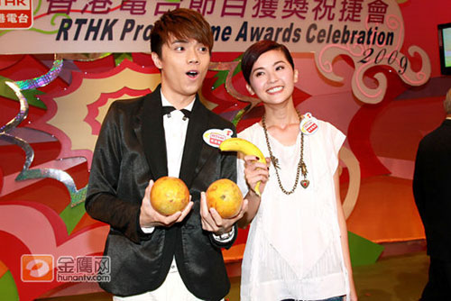 蔡卓妍(阿Sa)、張敬軒6日為港臺獲獎祝捷會擔任頒獎嘉賓,會上公布0八至0九年度獲得的七十七個國際及本地電視獎項;顒雍,阿Sa與軒仔影合照,軒仔拿著兩個大木瓜遞給阿Sa,并笑說:“以形補形!