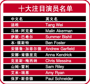 此次入圍十大注目演員的還有西部片《決斗猶馬鎮(zhèn)》的本•福斯特,他在影片中飾演反派羅素•克洛的手下,奸得令人心寒;之前,他還參演過《X戰(zhàn)警3》,飾演一名長有翅膀的戰(zhàn)警。此外,入圍的還有主演傳記電影《Control》的男主角山姆•雷利、本•阿弗列克導(dǎo)演處女作《失蹤人口》的女星艾米•瑞恩、與布拉德•皮特同臺演出《刺殺神槍手》的保羅•施奈德等。