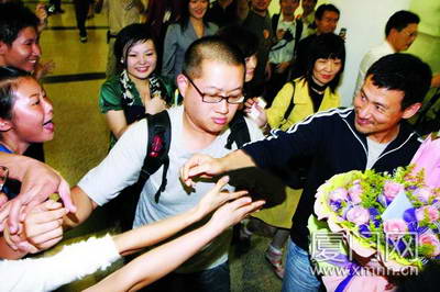 昨天下午,本次友迷“高考”的狀元唐艷艷也加入了機場的“友迷”大軍。她告訴記者,自己是晚報娛雯子的鐵桿“粉絲”,經(jīng)常在雯子博客上發(fā)表評論。見到這份“高考”試卷后,從小聽張學(xué)友的歌長大的她便第一時間參加了答題,沒想到居然拔得頭籌!霸嚲砩系念}目非常有意思,一看就會被吸引住”,她直夸出題的人“太有才了”,居然連張學(xué)友所扮演過角色的武功高低都能弄清楚。唐小姐獲得了張學(xué)友廈門演唱會的門票,幸福得“暈乎乎的”。而之后在親眼見到學(xué)友哥本人后,她“更暈了”。(記者 龔小莞)