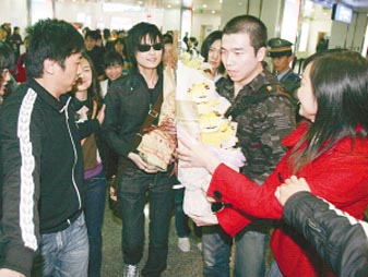 記者20:50左右抵達機場時,并沒有看見大量的“玉米”,不過21:00過,他們就從四面八方匯集到了一起——原來“玉米”們其實早就到了現場,不過為了防止機場方面過度 “緊張”,他們主動地化整為零,“隱藏”在了人群里。此次,“玉米”們沒有像以前那樣,穿著統(tǒng)一黃色玉米服,而是什么顏色都有,但還是組織有序,整齊地站成兩排迎接。