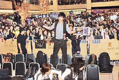中新網(wǎng)12月27日電 羅志祥(小豬)昨午由臺灣抵港,出席下午在將軍澳新都城商場舉行的簽唱會,約三十名“粉絲”接機,雖然步出機場時面露疲態(tài),但出席簽唱會時,小豬馬上又充足電,且十分親民,跟Fans抱抱之余,大合照時還舉起Fans自制的牌合照,還輕觸Fans玉手,逗得全場瘋狂大叫。簽唱會吸引近千人圍觀,場面熱鬧!