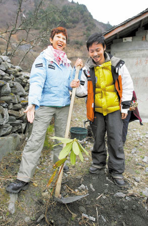 聽說昨天是第30個植樹節(jié),蔡少芬和張晉夫婦就在夾拉村的半山腰栽下了一棵杜鵑,兩人拿起鋤頭在鋪滿碎石片的山上努力挖樹坑,蔡少芬一副很賣力的樣子,村長想去幫忙還被她拒絕了:“不用,我們兩個來挖就可以了!睒淇油诤煤,蔡少芬小心翼翼地把一棵帶著花骨朵的杜鵑放在樹坑中,而張晉則非常專業(yè)地把樹坑填好,然后蔡少芬給杜鵑澆了滿滿一桶水,看著兩人的勞動成果,蔡少芬一臉的知足,她甚至十分激動地說:“我們叫它‘晉芬樹’,希望它茁壯成長,早日開花結(jié)果。”最后兩人在小樹旁留下了甜蜜的合影,看來兩人大有不久生子的意思。