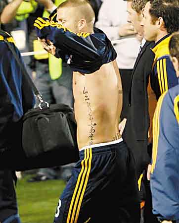 身為美劇《越獄》男主角邁克的鐵桿粉絲,大衛(wèi)·貝克漢姆正積極模仿他的偶像:把自己的身體文滿文身。近來隨著洛杉磯銀河隊(duì)到訪中國的上海和香港,小貝的身上也留下了中國的印記——增加了肋部的一行中國文字。