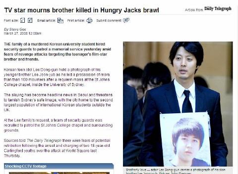 3月26日,李東健的弟弟生前就讀的悉尼大學的韓人留學生會,在學校某教堂內(nèi)為其安排追悼彌撒。李東健及其家人前來參加。