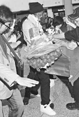 當(dāng)天李準(zhǔn)基一出機場就引發(fā)現(xiàn)場騷亂,雖有10名保安人員將李準(zhǔn)基圍住,卻依然抵擋不了粉絲們的熱情。混亂中,李準(zhǔn)基左腳的白色球鞋被歌迷踩掉,禮物也散落了一地,現(xiàn)場一時很尷尬。