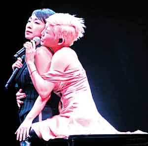 劉美君一連兩場(chǎng)“大開色界演唱會(huì)”于前晚結(jié)束,繼首場(chǎng)跳辣舞玩盡男嘉賓后,尾場(chǎng)換了口味,與嘉賓林憶蓮?fù)妗皵啾诚嘤H”,掃胸、摸背、擁抱樣樣齊全,不過另一嘉賓蘇永康不但無艷福享,還大爆劉美君當(dāng)年是眾男的幻想對(duì)象。
