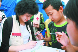 對于震區(qū)的孩子們來說,如何克服緊張和恐懼,如何擺脫不好的記憶,如何能夠在今后健康的成長是最重要的,也是高敏和心理醫(yī)生此行的主要目的。在每個孩子都介紹了自己的名字之后,高敏又讓每一個孩子都介紹三個自己認(rèn)為自己擁有的優(yōu)點。她又身體力行地說:“我認(rèn)為我的眼睛大,走到哪里都愛笑,能夠帶給別人快樂,最后我擅長跳水!痹谒膸酉,每個小朋友都非常自豪地向所有人介紹自己的優(yōu)點!拔遗艿每臁、“我數(shù)學(xué)好”、“我特別有禮貌”……“小朋友們,你們知道奧運賽場上每個人都非常緊張,都好怕,但是為什么我能夠成為最后的冠軍嗎?”高敏說,“小朋友說因為‘自信、拼搏和堅強’。你們說的都對,但是僅僅這些是不夠的,你要比別人再做得好一點。這依靠的是平時每一天超越自己!备呙襞e例告訴現(xiàn)場每一個小朋友,如果他們每天寫100個字就到達(dá)了極限,那么就努力讓自己再多寫10個,這樣到了關(guān)鍵的時候,才能夠真正地爆發(fā)出常人所沒有的力量!俺阶约。這是我昨天上課的主題。”高敏說,“和他們在一起時間過得真快。離開之前,我給我的學(xué)生們留下了一句話!髳蹮o形,真愛不死,愛的路上,你們永遠(yuǎn)不孤單!’”