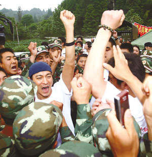 經(jīng)過兩個小時的車程,劉德華一行抵達(dá)了向峨鄉(xiāng)的救援部隊駐地。得知劉德華等人要來,數(shù)千戰(zhàn)士已在那里等候。看到明星,平靜的現(xiàn)場沸騰起來。為了維持秩序,士兵們自覺地手拉手圍成一個圈,把明星們圍在里面。