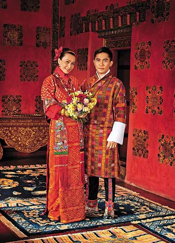 “偉玲”在不丹結(jié)婚成為當?shù)匾患⑹,不丹王室更特別打破慣例,提供皇宮的寢室給新人拍婚紗照,并由不丹皇叔夫婦(即將登基國王之叔)親自為這對新人著裝,據(jù)了解,偉仔的禮服正是當年皇叔結(jié)婚所穿的禮服,而嘉玲所穿的禮服則是王妃他們?yōu)槟陜H兩歲的女兒日后出嫁所準備的嫁衣。