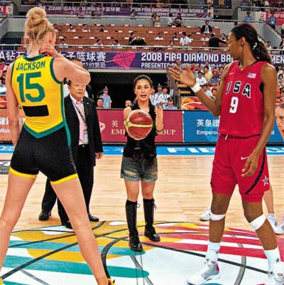 一身黑色打扮的阿嬌,昨晚在浙江為美國對(duì)澳大利亞的籃球決賽主持開球禮。