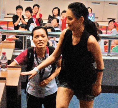 主辦單位事前未有公布阿嬌擔(dān)任昨晚決賽開球禮嘉賓,只注明賽事有神秘嘉賓出現(xiàn),至昨晚約7時(shí)半,當(dāng)美國及澳大利亞兩隊(duì)唱完國歌后,大會(huì)司儀便介紹阿嬌出場(chǎng)說:“有請(qǐng)嘉賓鐘欣桐小姐主持開球禮!彪S即見身穿黑背心、黑長(zhǎng)襪、黑鞋及牛仔短褲的阿嬌,在英皇高層周柱輝陪同下進(jìn)場(chǎng),不過阿嬌的一身黑色打扮,未有令她看來變得纖瘦,反而凸顯她的粗壯手臂和大腿。