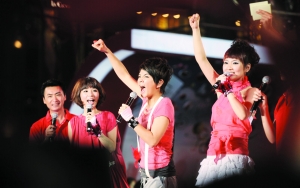前日是北京奧運開賽首日,陳燮霞和龐偉分別在女子舉重48公斤級和男子十米氣手槍決賽中奪得金牌。為此,可口可樂昨晚在世貿(mào)天街廣場舉行慶祝中國首日奪金的儀式,成龍、S.H.E都出席并與市民一起分享了喜悅心情。當大屏幕上回放陳燮霞奪金的瞬間時,S.H.E三人忍不住在臺上歡呼雀躍?赡苁切那樘^激動,三人現(xiàn)場演唱第一曲《中國話》時,竟然有點走調(diào)。