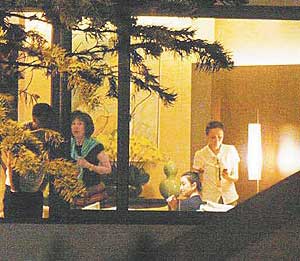 中新網(wǎng)8月26日電 “梁太太”劉嘉玲婚后沒(méi)有改變社交生活的習(xí)慣,動(dòng)不動(dòng)就請(qǐng)友人到家飲酒餐敘,前晚北京奧運(yùn)在鳥(niǎo)巢的閉幕式,她又找來(lái)3男3女好友到山頂?shù)脑⑺鶜g聚,梁朝偉(偉仔)雖然不好應(yīng)酬,但他仍然極力扮演男主人的角色,當(dāng)友人對(duì)他家花瓶感到興趣時(shí),他立刻充當(dāng)藝術(shù)品指導(dǎo)仔細(xì)講解。