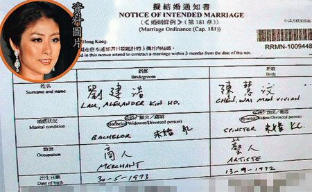 中新網(wǎng)9月17日電 香港媒體報(bào)道,陳慧琳(Kelly)和未婚夫劉建浩(Alex)拍拖16年,終于結(jié)束愛(ài)情長(zhǎng)跑,兩人將于下月2日拉埋天窗,并于洲際酒店筵開(kāi)55席宴請(qǐng)親朋。昨日在金鐘婚姻登記事務(wù)及紀(jì)錄辦事處,張貼了Kelly和Alex的擬結(jié)婚通知書,當(dāng)中寫上Kelly的真名“陳慧汶”及她身份證原用的英文名“Vivian”,而原來(lái)Alex的英文全名是“Alexander”,不過(guò)多年來(lái)外界已習(xí)慣簡(jiǎn)稱他做“Alex”。通知書上也列出Kelly和Alex的出生日期,Kelly是72年9月,而Alex則是73年5月,Alex比Kelly差不多小一年。