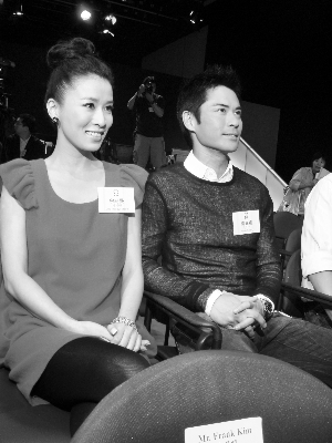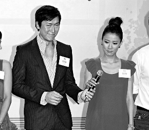 被現(xiàn)場媒體起哄合影,佘詩曼臉紅,鄭嘉穎笑容僵硬。馬婷 攝