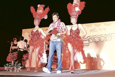 劉德華被森巴女郎夾在中間表情逗趣。圖片來(lái)源:香港《明報(bào)》