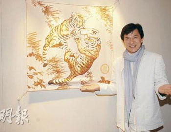 成龍與某品牌合作推出老虎圖案的限量版絲質披肩,將會在香港義賣籌款。(圖片來源:明報)