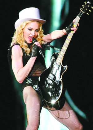 演唱會上,麥當(dāng)娜仍然堅持一貫的熱歌辣舞的風(fēng)格,當(dāng)麥當(dāng)娜唱完第二首歌后,坐在第一排的埃里克斯從舞臺下給麥當(dāng)娜遞上一瓶水。(圖片來源:新京報)